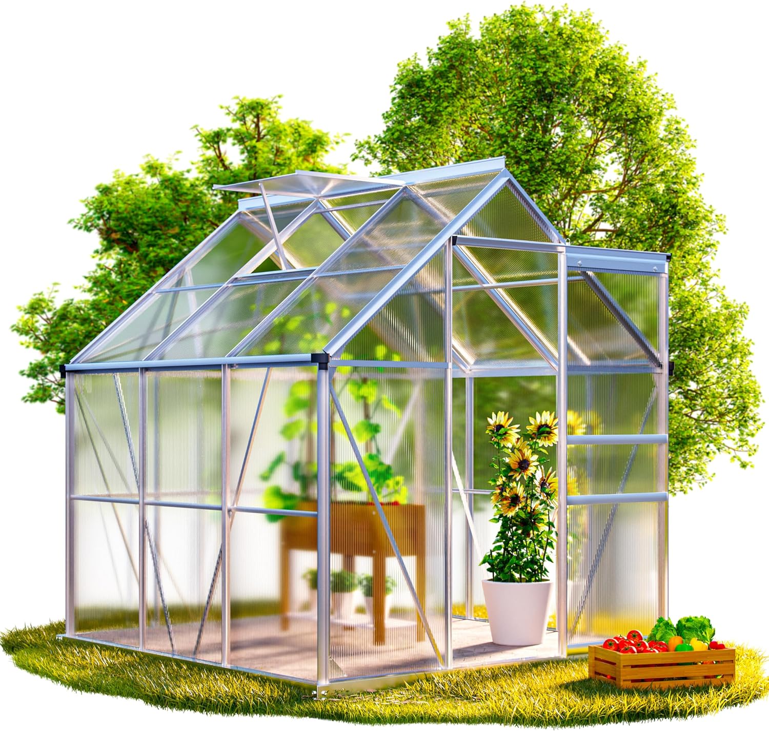 INVERNADERO DE ALUMINIO: Este invernadero de jardín está fabricado con perfiles de aluminio anodizado y paneles de policarbonato de doble pared. El aluminio es resistente a la intemperie y no se oxida, asegurando su uso en exteriores. ESTABILIDAD: Con refuerzos adicionales en las paredes, los laterales y el techo, la estructura del vivero ofrece estabilidad en condiciones climáticas adversas. Los tornillos autoblocantes facilitan una fijación segura. La puerta corredera lleva un cerrojo. VENTILACIÓN: Una ventana abatible en el techo y una puerta amplia permiten una buena circulación del aire, favoreciendo el crecimiento de las plantas. El canalón con orificio de desagüe redirige el agua de lluvia. CIMIENTO DE ACERO: El cimiento de acero galvanizado con conectores en T proporciona estabilidad estructural y mantiene el invernadero nivelado. Se sugiere anclarlo con hormigón para mayor resistencia. USO DURANTE TODO EL AÑO: Este invernadero ofrece espacio para cultivar, proteger o reproducir plantas. Adecuado para el cultivo de verduras, hierbas aromáticas, germinación y protección invernal de plantas sensibles.